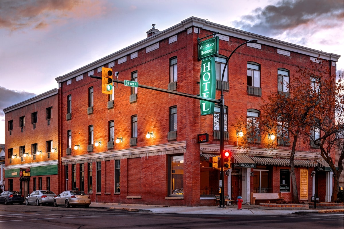 El "Baker" se encuentra en el corazón del centro histórico de Cranbrook, con pubs, restaurantes, una tienda de comestibles y tiendas únicas, todo a poca distancia. Este hermoso hotel de ladrillo antiguo (alrededor de 1923) tiene un increíble encanto art déco. Nuestra nueva "suite Banker" se ha rehecho para destacar las características históricas del edificio. La suite incluye una ducha a ras de suelo, cama tamaño king con cuna extraíble, aire acondicionado, dos televisores grandes con cable e internet de alta velocidad y una cafetería.