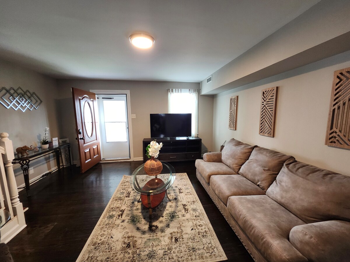 Casa de varias unidades recientemente renovada, céntrica en un barrio suburbano. Esta unidad del primer piso es un apartamento de 2BR/1BA con entrada independiente. Completo con todo lo que necesitas para un viaje de trabajo, escaparte o una estadía más larga. La unidad cuenta con una cocina completa, sala de estar con sofá cama. La cocina tiene electrodomésticos de acero inoxidable de tamaño completo, platos, utensilios de cocina y pequeños electrodomésticos de cocina. Hay wifi rápido, entrada sin llave/llegada autónoma, Smart TV en cada habitación y una lavadora y secadora en la unidad.