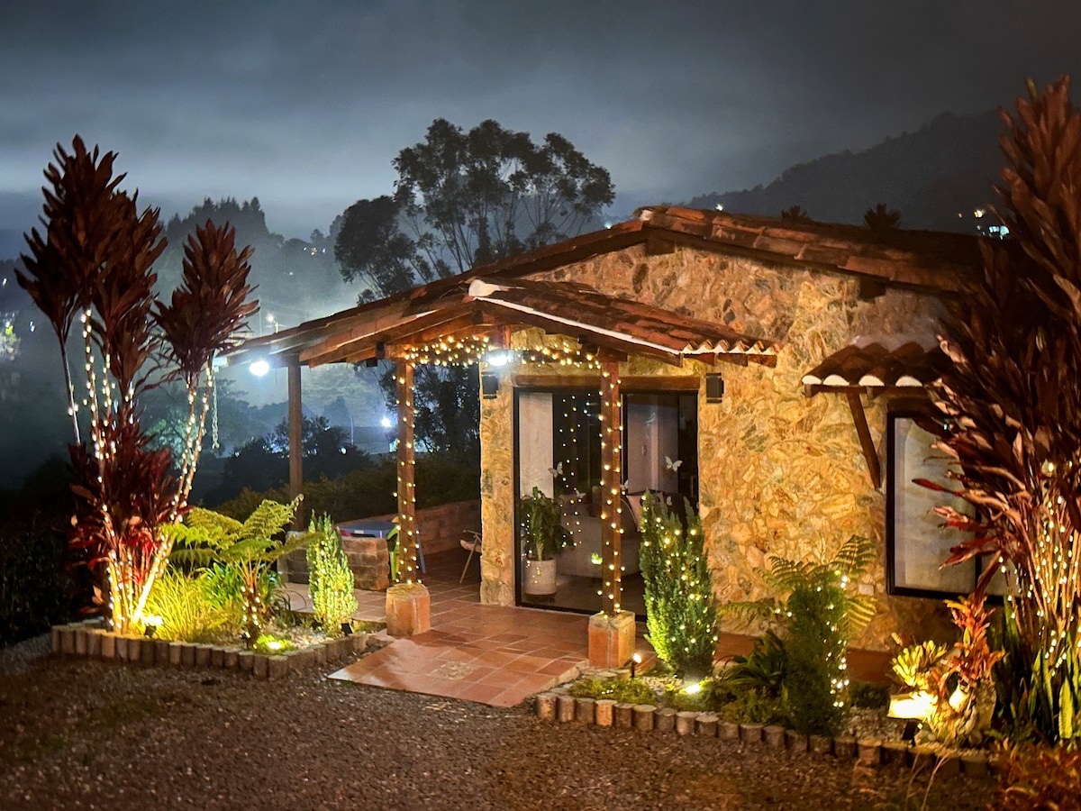 Casa campestre con zonas verdes y hermosas vistas , ideal para viajeros que quieran desconectarse con la naturaleza o teletrabajar en un ambiente tranquilo; completamente equipada se divide en 2 habitaciones, 2 baños, sala-comedor-cocina y terraza en exterior, ubicada a 15 minutos del aeropuerto internacional Jose maría cordova ( ofrecemos transporte), a 5 min de la zona urbana y a 10 minutos del parque de Rionegro y de San Antonio de Pereira. El jacuzzi tiene un costo adicional de 30 mil la hr