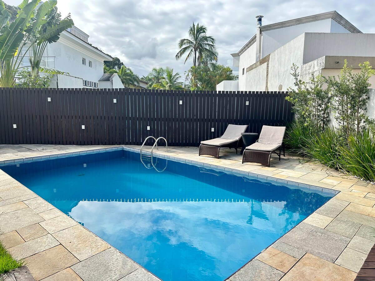 Casa de temporada a 150 m de la playa de Pernambuco (Guarujá). Finamente decorado, ofrece 3 amplias suites con aire acondicionado, una sala de estar con doble altura de techo, un altillo con chimenea y un sofá cama. Cocina completa, aseo y baño tropical al aire libre junto a la piscina. Zona de ocio con piscina, césped, barbacoa y horno de leña. Garaje para 2 coches. Junto a Pão de Açúcar, Shopping Jequitimar, Companhia da PM a 400 m de la casa.