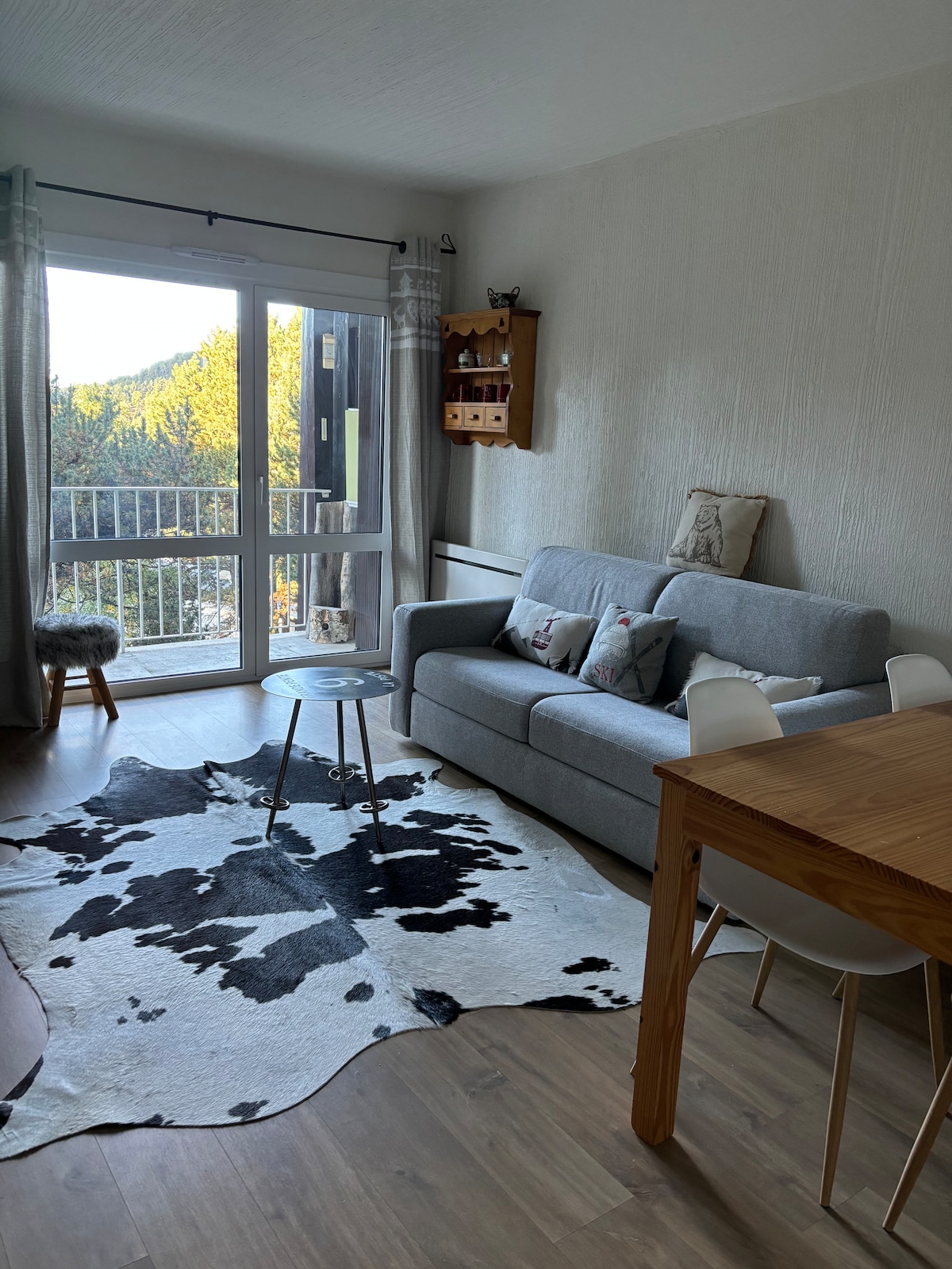 Apartamento de montaña acogedor totalmente nuevo situado en Angoustrine. Exposición orientada al sur, zona muy tranquila y muy bien expuesta. Consta de una cocina americana equipada y un salón que consta de una sala de estar + sofá cama con acceso a una terraza privada con impresionantes vistas a la cadena de los Pirineos Francesa y Española. Dos habitaciones equipadas con camas de matrimonio, una de ellas con acceso a la terraza. Baño con ducha italiana y aseo separado. Calefacción estufa de pellets
