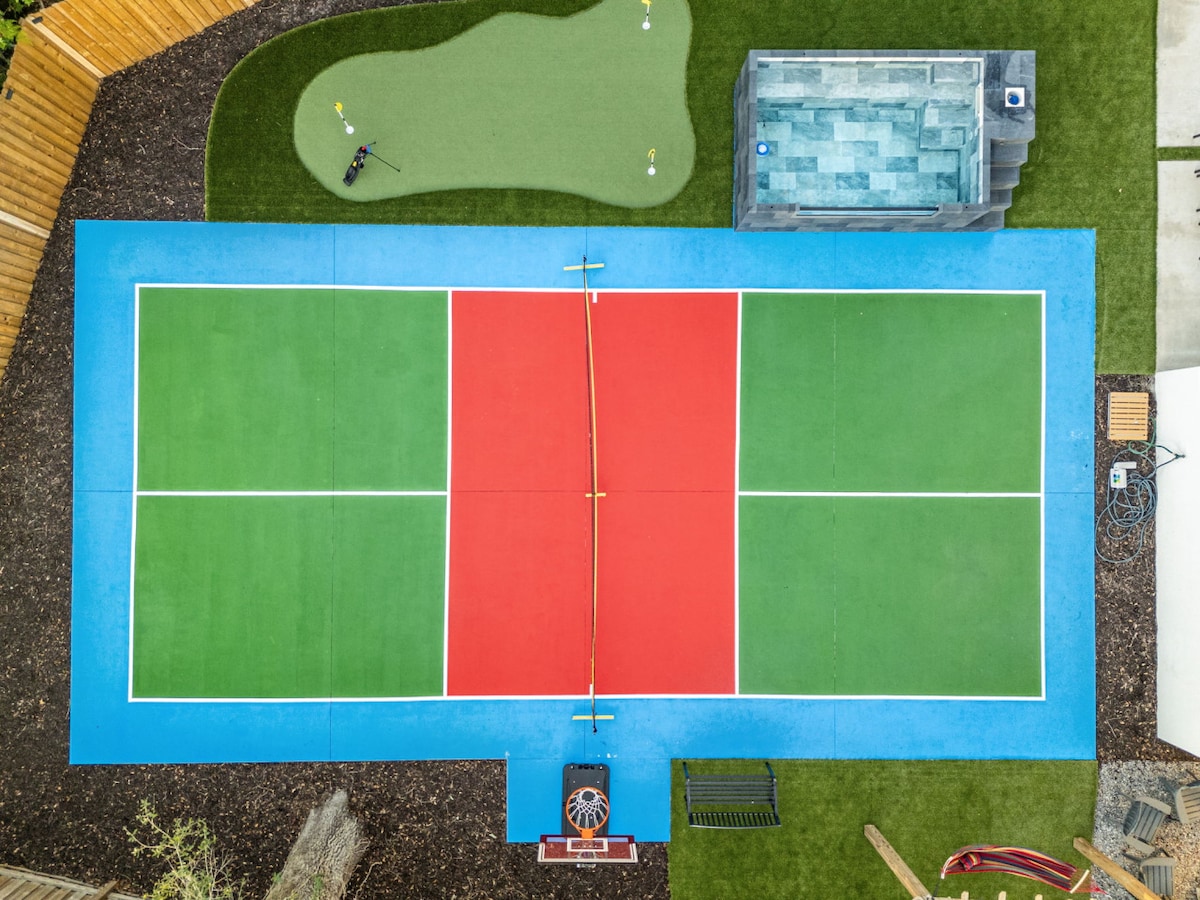 Oasis junto al río con spa acuático y cancha de baloncesto a pie del zoológico