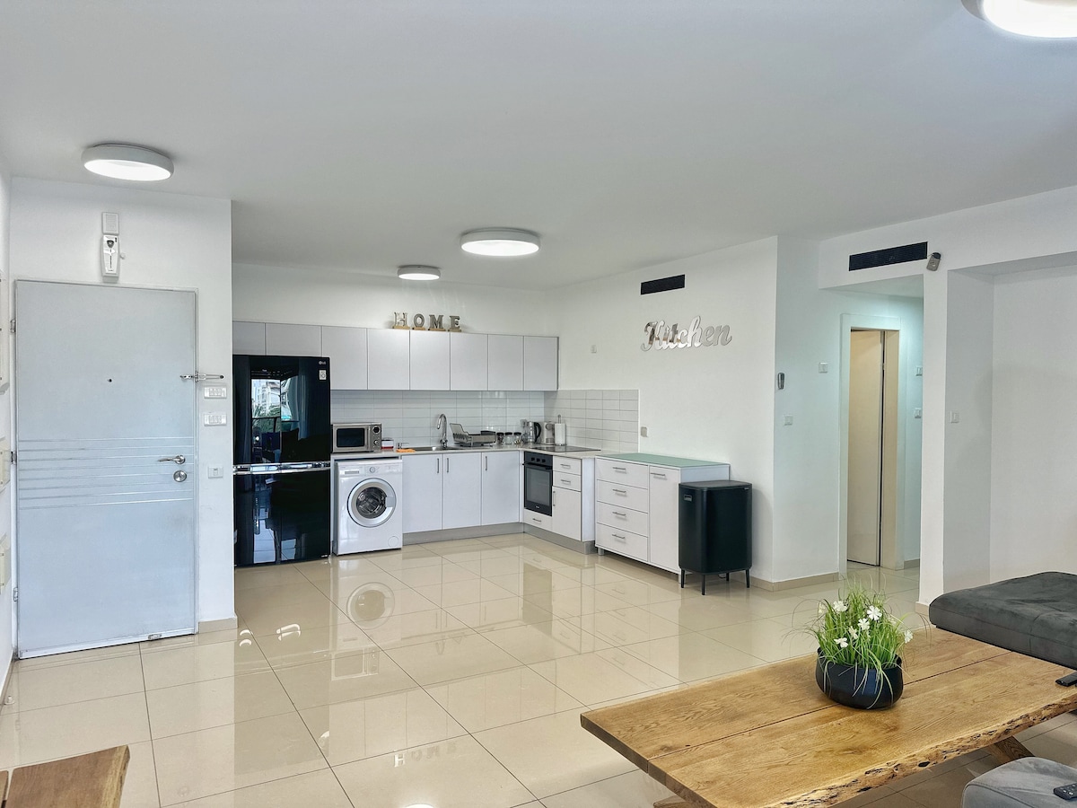 Este lugar es perfecto para unas vacaciones familiares o un viaje de negocios. Los apartamentos están en una residencia tranquila con vistas al mar y a las montañas. A 10 minutos del mar, centros comerciales y bares. Al lado de la sinagoga más hermosa de la ciudad. Estacionamiento gratuito en las instalaciones, carga para autos eléctricos, gimnasio ($). Se actualizó el departamento. Aire acondicionado nuevo. A petición de los huéspedes, la ducha aumenta. Lavadora, Nespresso, tostadora, secador de pelo, Wifi, Netflix, cocina. Cama y 2 sofás plegables. Hay un refugio en el sótano.
