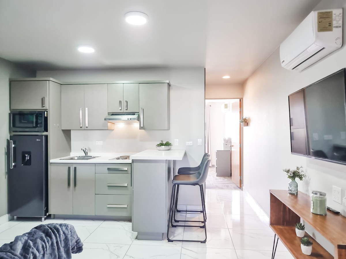 Departamento moderno en area segura ideal para estancias comodas ubicado a corta distancia caminando de bancos restaurantes gimnasio y zona hotelera perfecto para viajeros de negocio o descanso cuenta con espacios funcionales iluminacion agradable y ambiente tranquilo estacionamiento disponible sobre la acera cercano a todos los servicios necesarios para una experiencia practica accesible y confortable en la ciudad. Ubicado en segundo piso.