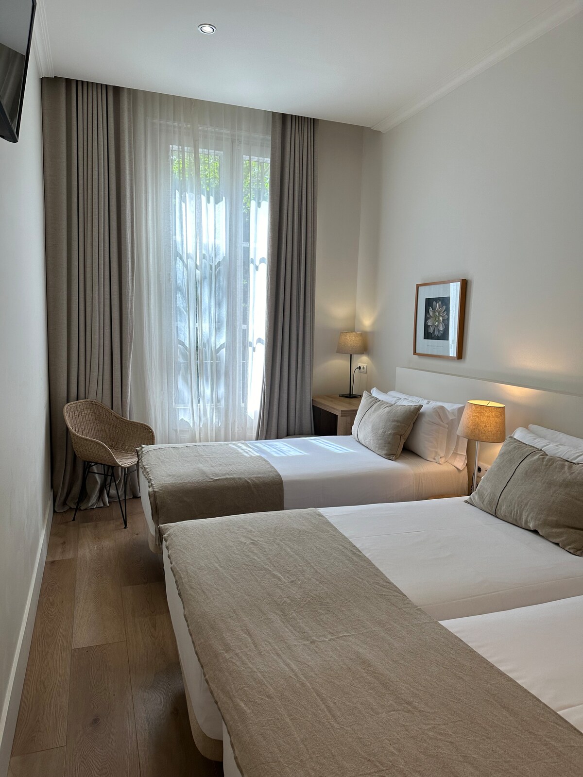 Habitación doble exterior moderna y acogedora en Hostemplo Sagrada Familia. Está equipada con baño privado completo, aire acondicionado frío-calor, TV y una cama doble o dos camas individuales (bajo petición, sujeto a disponibilidad). Para tu comodidad, ofrecemos café con leche y aperitivos en recepción. Cada habitación mantiene el mismo estilo y nivel de confort, aunque puede haber ligeras variaciones en su distribución o decoración.