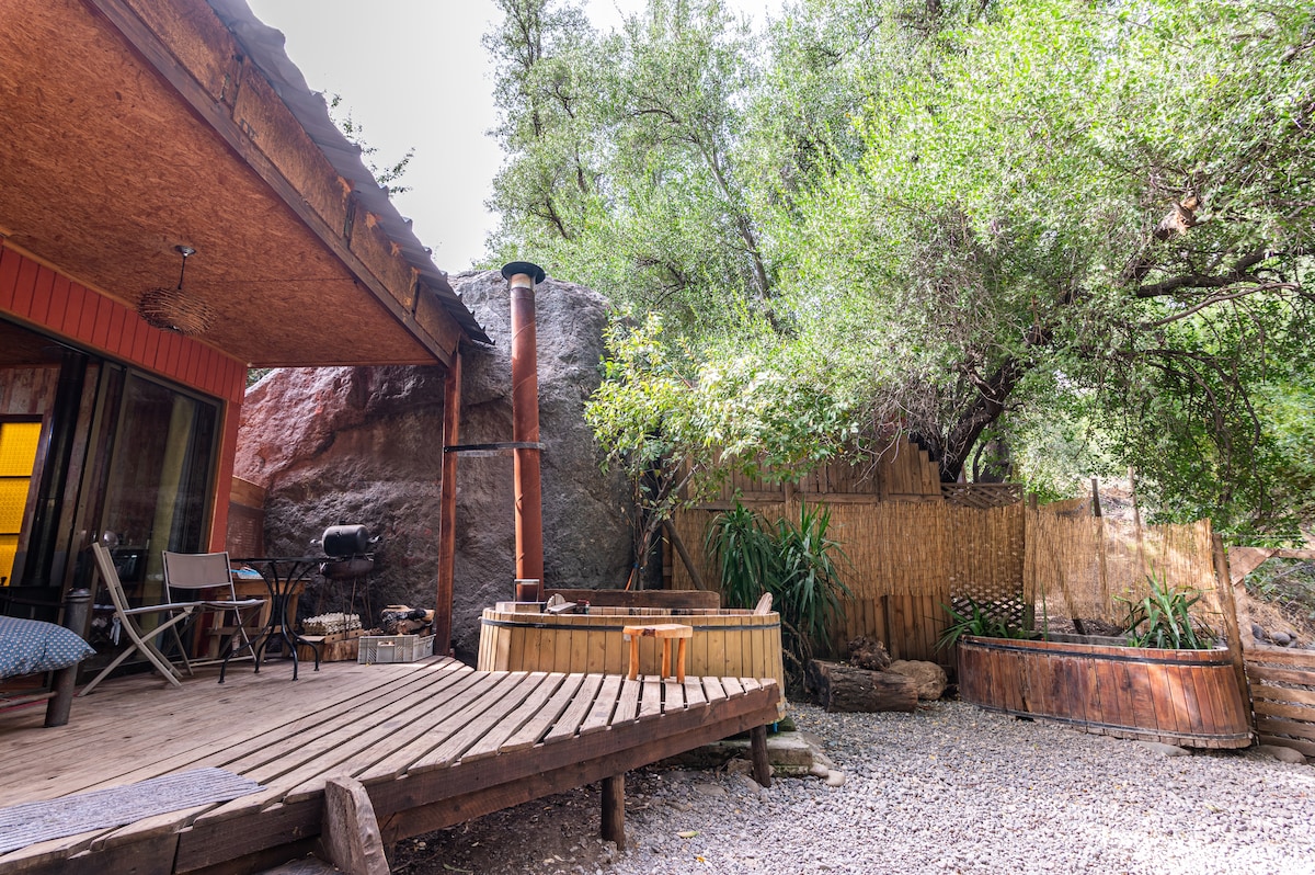 Pequeña cabaña rústica,de un ambiente, SIN cocina, con parrilla en la terraza.Inserta entre grandes arboles, a metros del rio Maipo con acceso exclusivo para la cabaña. Cuenta con terraza y estacionamiento privado. Alojamiento ideal para parejas y aventureros, tinaja con agua caliente en la terraza, para relajarte con el sonido del río bajo un cielo estrellado. La tinaja es de uso privado y sin horarios.