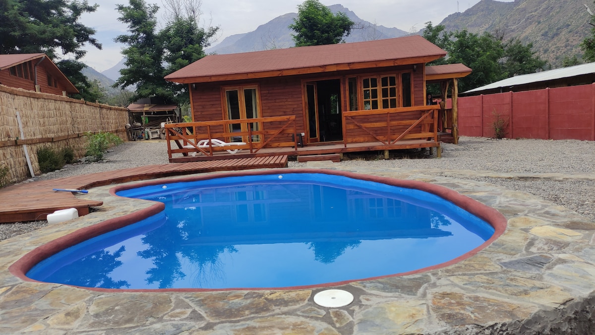Cabaña y piscina uso exclusivo, tranquilo poblado El Ingenio, a 18km Plaza San José de Maipo. Casa 65 m2, terreno 500 m2. Caben 6 personas, 2 dormitorios, 2 baños, 1 cama matrimonial, 1 cama nido y 1 camarote. Hay sabanas y toallas, cocina equipada, bosca leña, piscina de 3,5x5mt x 1.30 mt . Sitio cercado, se aceptan 2 MASCOTAS. PROHIBIDO MUSICA JARDIN. Mín. 2 noches. Llega bus, colectivo, auto, bicicleta, camino pavimentado. Hay Wifi, Almacenes. Vista cordillera.