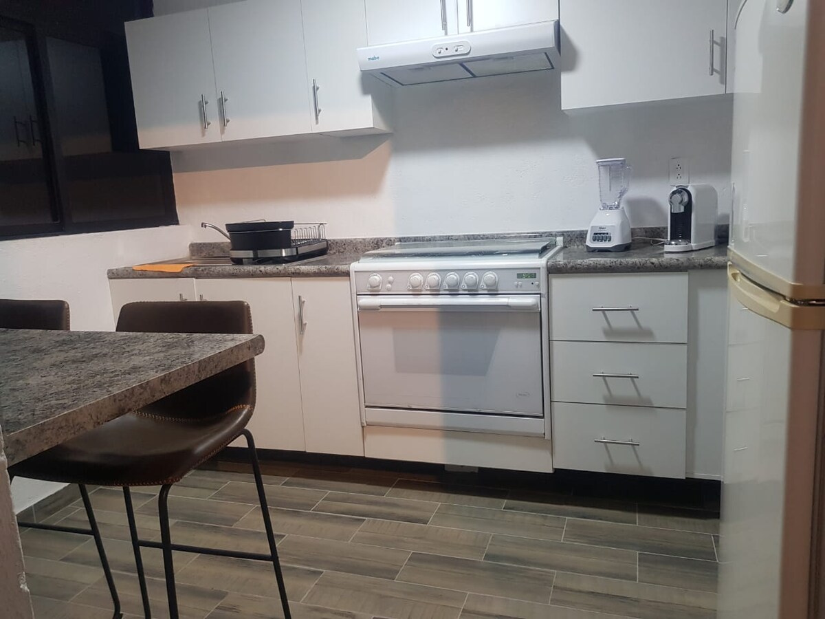 El departamento esta cómodo. Tiene excelente ventilación e iluminación, una decoración linda y moderna. Buscamos que sea el lugar ideal para llegar a descansar. En un cuarto piso y cerca para visitar los viñedos cercanos (puerta de lobo a 25min) o visitar la Peña de Bernal (35 min de distancia). A pesar de estar dentro de la Pradera, Villas del Refugio es un Conjunto habitacional con vigilancia propia y caseta de policía justo en la entrada, todo seguro.