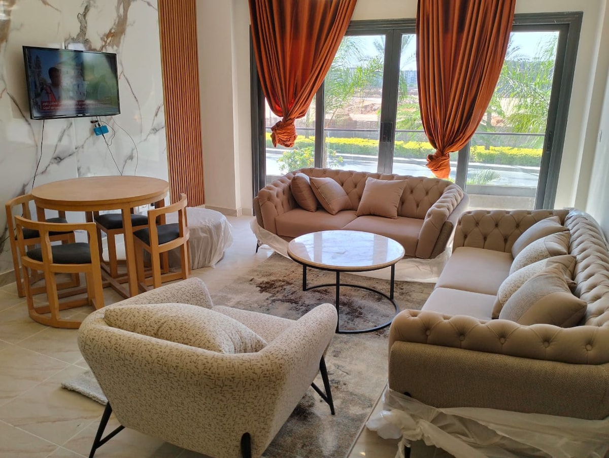 Un APARTAMENTO ENTERO con un jardín trasero situado en una zona hermosa y verde en una comunidad pacíficamente integrada que satisface todas las necesidades de los residentes. Las habitaciones están recién amuebladas, con aire acondicionado, TV inteligente y todas las comodidades que puedas necesitar, superLIMPIO y TRANQUILO. El apartamento está a 25 minutos del Aeropuerto Internacional de El Cairo. Cafeterías, restaurantes, supermercados y farmacias están cerca. Calidad de hotel con comodidad hogareña ofrecida a un PRECIO RAZONABLE.