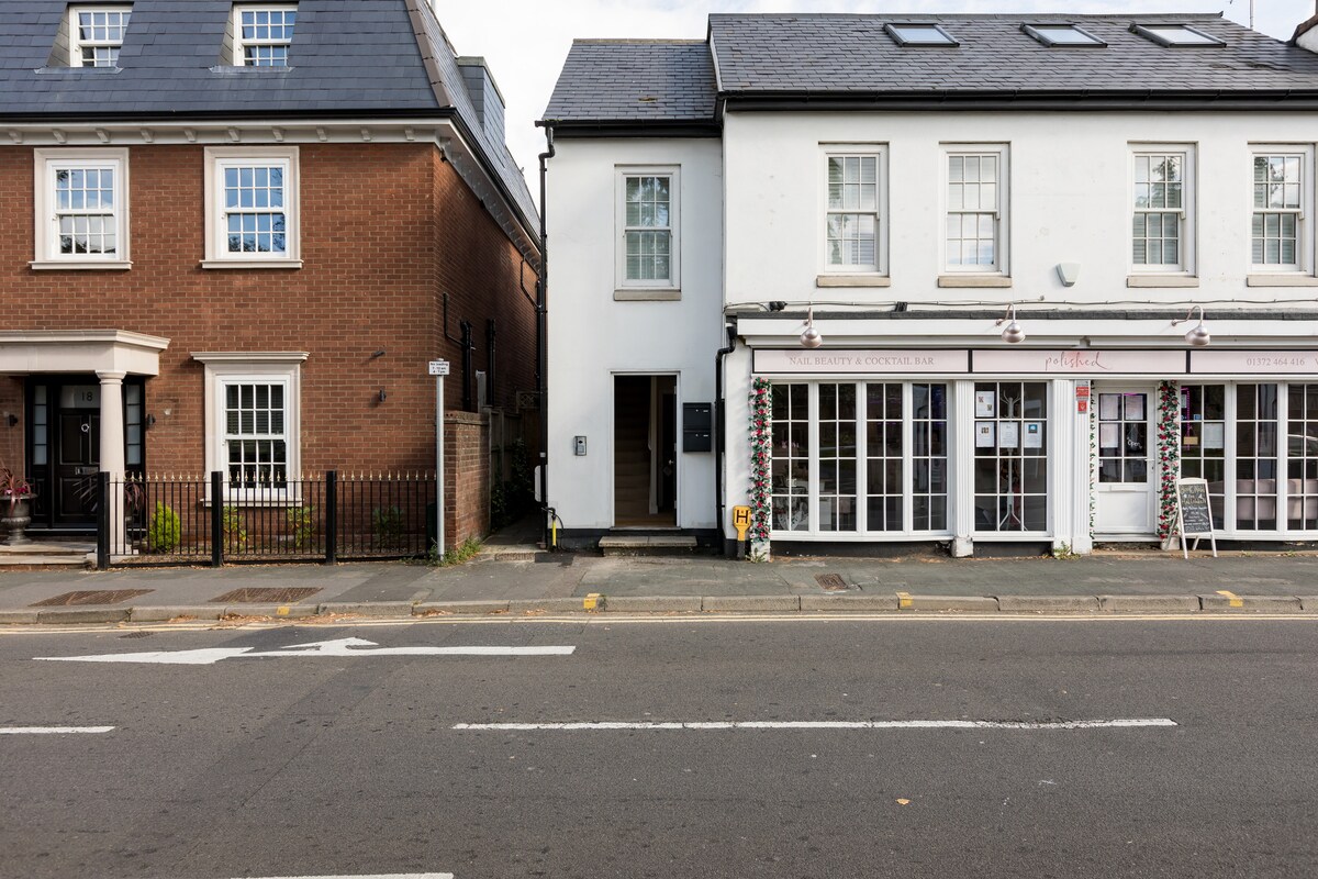 Entire Apartment stylishly furnished Scandinavian feel & professionally cleaned . Weybridge station, 1.4 miles away. WEYBRIDGE~LONDON 29 MIN. Good access to Shepperton Studios & Netflix. St Georges Hill Golf Club 8 Mins, Wimbledon is 20 MINS by train. Hampton Ct Palace close London H'row A'port 18 MINS by car. GATWICK 40 MINS. Central London an hour door to door A calming abode for visiting family & friends like home from home in a picturesque street , Near river, park Waitrose & Town