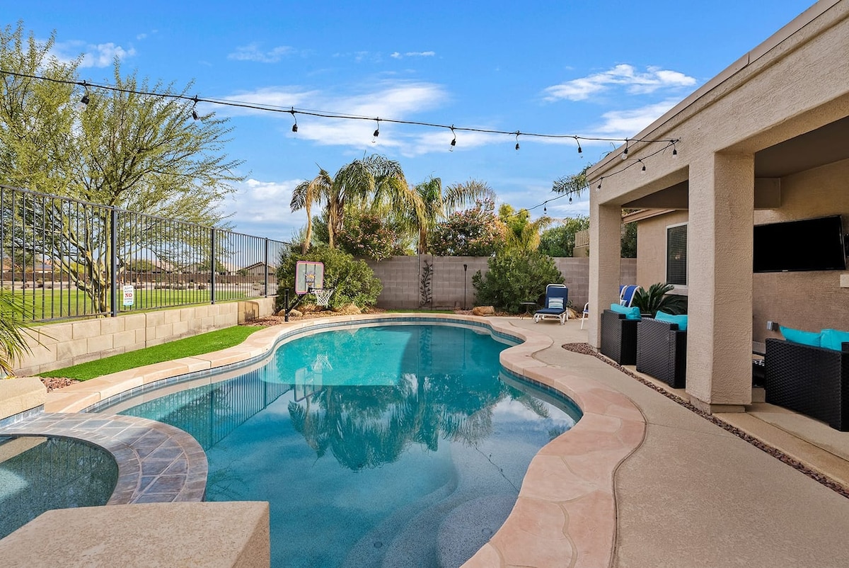 Escape to this luxurious 7,000 sq. ft. villa in Casa Grande, Arizona, perfect for families and group retreats. With 5 bedrooms, a private indoor and outdoor movie theater, a stunning heated pool with a slide, and ample outdoor entertainment options, your stay here promises fun and relaxation. Enjoy spacious living areas, gourmet kitchen, and a backyard oasis featuring a fire pit and outdoor kitchen. Experience the perfect blend of luxury and comfort for your unforgettable getaway!