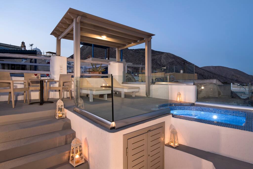 Suite con piscina de inmersión al aire libre y vistas a las cúpulas azules