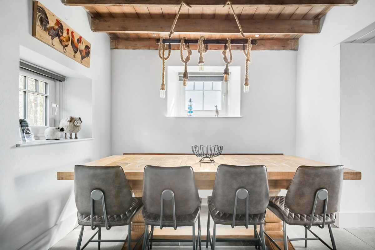 A medida que las olas rompen contra la arena dorada, el sonido del mar llega hasta Dan Y Graig y, con impresionantes vistas del terreno, hace que una estancia aquí sea mágica. Esperamos lanzar nuestras conversiones de graneros para 2019, así que no te pierdas el emocionante progreso. La casa Dan y Graig es una granja victoriana, por lo que nos hemos esforzado por conservar todo el encanto y el carácter que ofrecen sus características originales, al tiempo que hemos introducido elementos contemporáneos para actualizar su atractivo y hacerlo más adecuado para el viajero de hoy, ya sea un excursionista, surfista o un grupo de amigos o una familia que desee pasar unos días en el lujo costero. El estrecho camino que serpentea hasta la granja es un poco rocoso en algunos lugares. Estás subiendo la montaña, no lo olvides, ¡pero merece la pena! Las vistas desde Dan y Graig son impresionantes, mirando directamente hacia St. Davids sobre el campo de golf de la ciudad y luego hacia abajo a la playa de Whitesands, a solo 300 metros de distancia, y, por supuesto, hacia el mar, la isla Ramsey y el faro Smalls. Junto con el magnífico telón de fondo de la montaña Carn Llidi y el increíble sendero costero que proporciona un entorno inmejorable. La espaciosa granja tiene capacidad para ocho personas entre sus cuatro elegantes dormitorios: dos habitaciones con cama tamaño king, una doble y una con dos camas individuales. Cada dormitorio ofrece lujosas plumas de ganso y ropa de cama de plumón de pato, sábanas de algodón egipcio y toallas Laura Ashley. El dormitorio cerca del mar se hará con almohadas sintéticas y edredón por si alguien tiene alergia a los rellenos naturales. Decorado en blanco limpio y brillante con cálidos tonos grises y destellos de color de los increíbles accesorios hechos localmente: mantas y cojines de Tregwynt Woollen Mill y alfombras de Solva Woollen Mill. El arte mural monocromático del artista de Solva Ian McDonald y los coloridos paisajes costeros de la reconocida Pauline Beynon enriquecen los espacios. Mientras que los dormitorios de la parte delantera son grandes y luminosos, con suntuosas camas grandes, los dos de la parte trasera de la casa son habitaciones de «estilo loft» que conducen a su propia escalera privada. Estas ofrecen una experiencia diferente, perfecta para los niños o el huésped que prefiera un espacio más acogedor. Para maximizar el espacio, hemos utilizado camas loft especialmente diseñadas que son un poco más bajas de lo habitual, para que no te golpees la cabeza en el techo con vigas al levantarte por la mañana. El baño del primer piso tiene una bañera con una vista única, relájate entre las burbujas y contempla directamente la bahía de St. Brides y el terreno costero. También hay una fabulosa ducha de vidrio y la ventana tiene una doble persiana con una pantalla mágica para cualquier grado de privacidad que requiera un huésped. ¡Atraviesa los niveles de la casa a través de la antigua escalera, rematada con una alfombra de fábrica de lana de Solva para realzar este espacio mágico! Un estilo inspirado en el mar se une a toques de Alicia en el país de las maravillas para evocar ideas de otro mundo. Una moderna araña de bombillas ámbar Edison que cuelgan como lágrimas del cielo inspira la imaginación. La planta baja presenta un amplio espacio para relajarse y entretenerse. Siéntate y lee en el acogedor pero más formal «Parlour»: recuéstate en las sillas con respaldo alado, reclínate en el Chesterfield de tweed y disfruta de las vistas. Enciende la estufa de leña cuando haya una tormenta afuera y disfruta de la comodidad de estar a salvo dentro, donde puedes planificar tu próxima aventura utilizando la guía «Twr Y Felin» en el mapa de St. Davids que cuelga sobre la chimenea. Este mapa es una gran fuente de conocimiento y fue creado por mi tío abuelo en 1923, y de hecho una vez fue propietario de la granja. Aunque se reimprimió en los años ochenta, el mapa es ahora difícil de encontrar. Reúnete con familiares o amigos al otro lado del pasillo en la habitación familiar más relajada que se abre al comedor de la cocina. Tiene un toque luminoso y moderno, con dos sofás de tweed magníficamente cómodos. Ideal para los días de lluvia, la sala de estar tiene un gran televisor inteligente para ver películas o suficiente espacio para juegos de mesa y otras diversiones familiares. Otra pequeña estufa de leña es conveniente para recargar el calor que la calefacción por suelo radiante proporciona ampliamente. Hay otra vista espectacular del paisaje accidentado a través de la ventana, y también puedes ver a los niños jugar en la terraza delantera. Abrimos esta habitación a la cocina/comedor para mejorar la calidad del espacio, dando un flujo mucho más libre y apertura al diseño. Si estás ocupado en la cocina, cenando o relajándote en la sala de estar, aún puedes ser sociable. Disfruta de cenar juntos alrededor de una pesada mesa rústica. Hay espacio para que ocho personas se sienten cómodamente alrededor de la mesa y hay una hoja extra escondida debajo de ella si quieres extender la mesa en caso de que vengan amigos. El chef de la casa puede cocinar utilizando el equipo Le Creuset en la parte superior de la cocina Rangemaster Range: una placa de cinco quemadores de gas, con plancha y tres hornos eléctricos deberían mantener al chef ocupado y abundante comida para todos. La vajilla de porcelana Villeroy & Boch «Manoir» y los cubiertos Dartington mejoran tu experiencia gastronómica en el interior, y hay un juego de vajilla de bambú si el clima es increíble y decides comer afuera. ¿Quién quiere lavar los platos cuando está de vacaciones? Nadie tiene que hacerlo, ya que hay un lavavajillas de tamaño familiar solo para facilitar las cosas. También hay una nevera Siemens de seis estantes con tres cajones congeladores si quieres abastecerte y evitar las compras diarias, que en verano pue