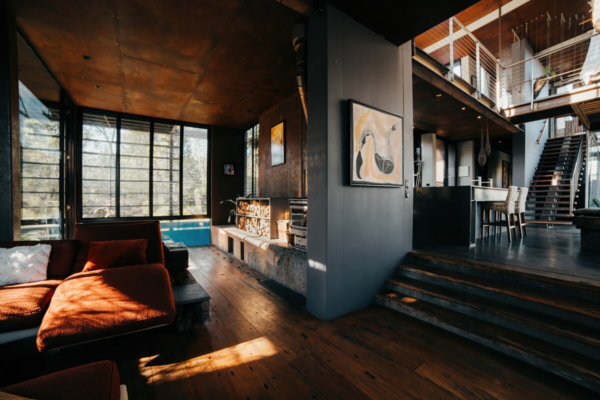 "Callignee Eco Bushhouse" is a sustainable, 100% off grid stand alone home nestled amongst 5 secluded acres of native bushland in the glorious Gippsland region. Architecturally designed, award-winning retreat featured on Grand Designs Australia. The space Callignee Eco Bushhouse operates on eco-friendly living principles and is 100% off grid, collecting its own electricity and water. **NEW- Now offering in-house massages and spa treatments. Enquire within for more information.