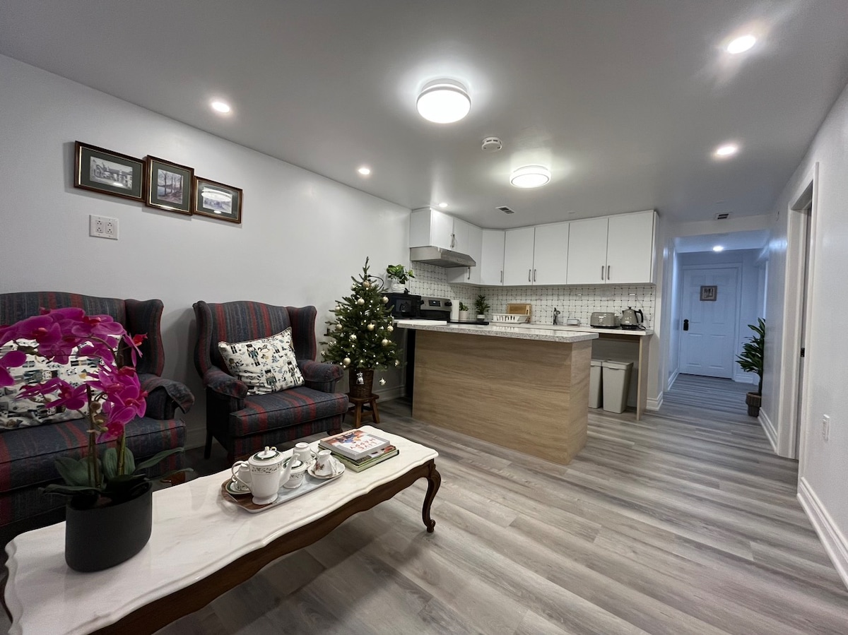 ¡Bienvenido a su elegante y moderna suite de dos dormitorios en Mississauga! Este «oasis» privado es perfecto para parejas o familias pequeñas. Disfruta de un patio sereno y un espacio cómodo diseñado con un toque boho-chic. Tu estadía incluye: Entrada privada y llegada autónoma Wifi y TV inteligente Cocina pequeña con microondas y cafetera Baño recientemente remodelado Aparcamiento gratuito Vivimos arriba y estamos disponibles si es necesario, lo que garantiza una experiencia tranquila y privada. ¡Te espera una escapada tranquila!
