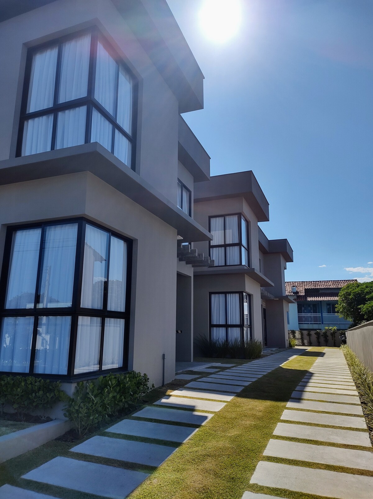 Em nosso espaço você encontra 3 sobrados novos, feitos com cuidado para receber quem busca conforto e descanso. A casa 3 tem vista para o jardim, fica 50m de distância do mar. Ela acomoda 6 pessoas e mais 2 extras. Temos 1 suíte e mais 2 quartos todos com ar condicionado. As duchas tem aquecimento solar. Cozinha completa, churrasqueira integrada, lareira externa, jardim. Wi-fi. 1 vaga de estacionamento. Tudo para o seu conforto. Não fornecemos roupa de cama, banho e panos de prato