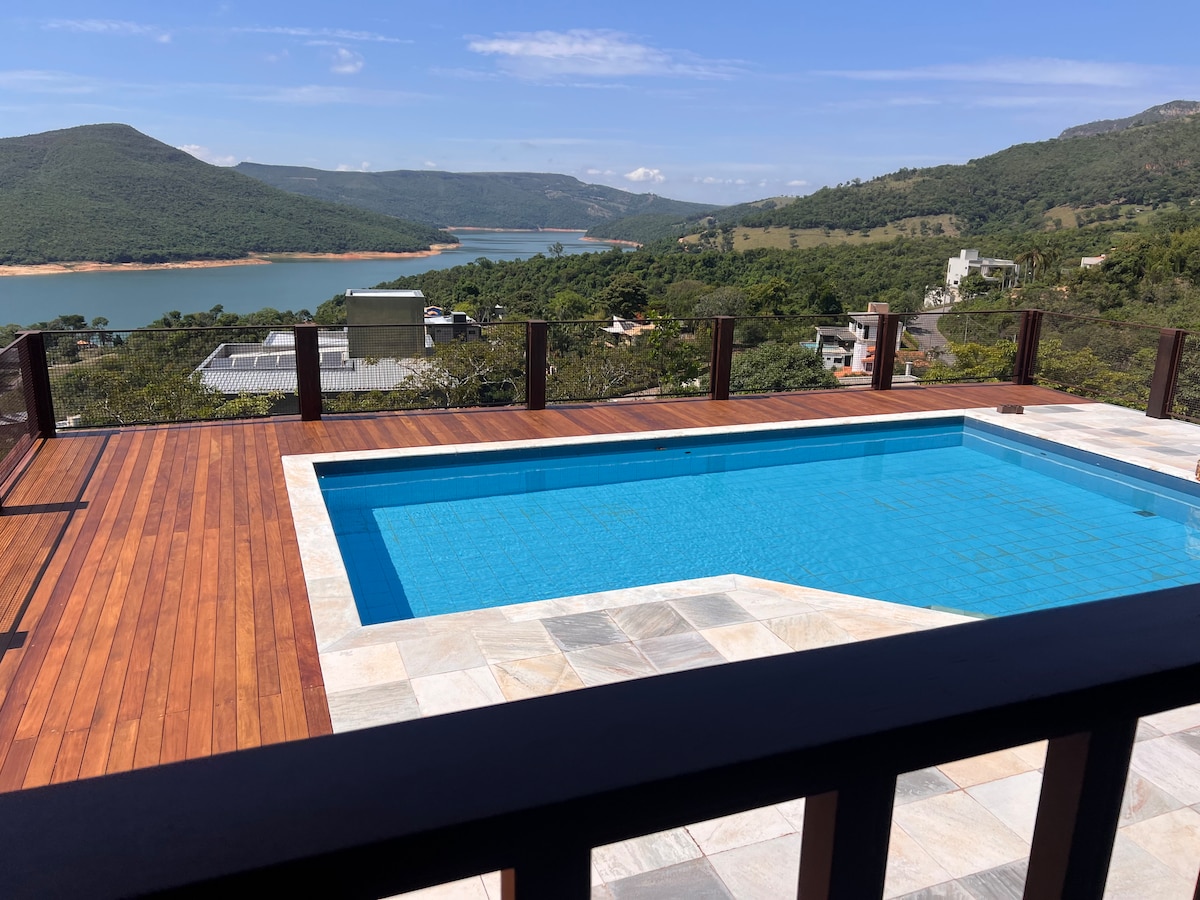 Casa em Capitólio Escarpas do Lagoon con vistas a la laguna: 4 suites , 2 semisuites, puede alojar hasta 20 personas, wifi, spa, piscina climatizada, sauna, barbacoa, sala de juegos, mini caja de baloncesto, terraza con vistas infinitas, tumbonas. Tres suites con aire acondicionado, otras suites con balcón y ventilador de techo. Vista al lago, hidroeléctrica y chimenea. Hay dos habitaciones con TV inteligente, chimenea y balcón con hamacas. Cocina con utensilios. Área de barbacoa de cerveza y piscina.