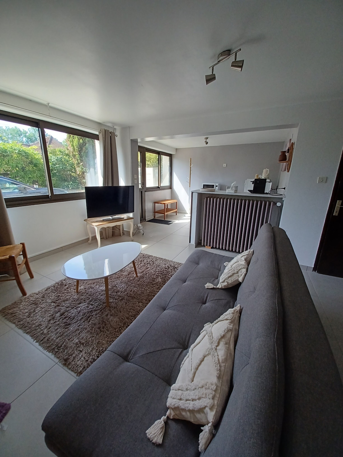 Situada a 15 minutos en coche de Orly (45 minutos en transporte) - 12 minutos a pie del RER C (cuenta con 1 hora para el centro de París) y a 2 minutos a pie del autobús 292, tranquilo y luminoso, nuestra dependencia en RDJ se beneficia de su propia entrada. Se compone de una cocina separada equipada (ver descripción), una sala de estar con zona de relajación, zona de escritorio y zona de noche (cama queen size 160), almacenamiento, TV, wifi, un baño y WC separados.