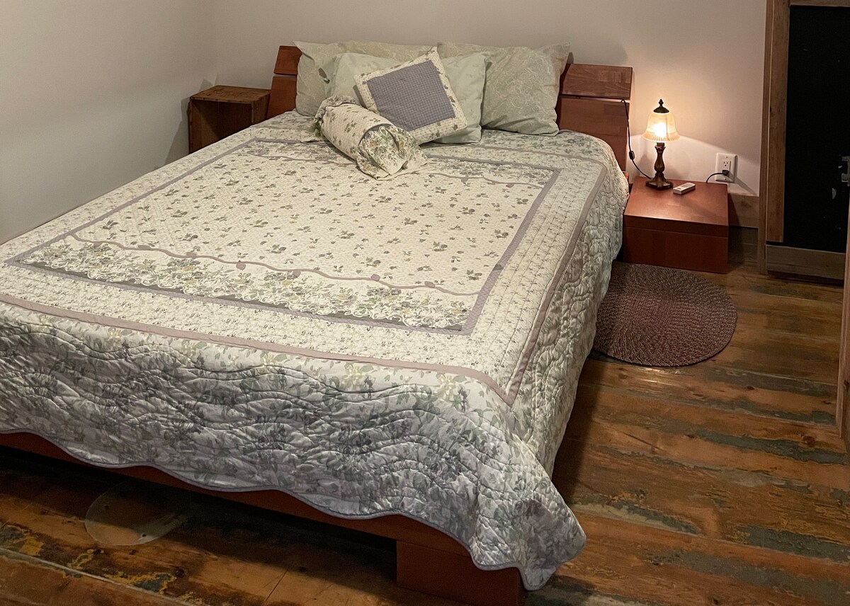 Studio in a central location around Lac Brome. You get to enjoy the lake view, while having a quiet backyard with a forest. Passionate of nature, hiking, cycling, skiing and water sports, you will be served. We built this house when we learned that our family was going to get bigger. We finished the studio with re-used material from the previous chalet that was on the land- from the kitchen cabinets, to the bedroom storage unit to the office table.