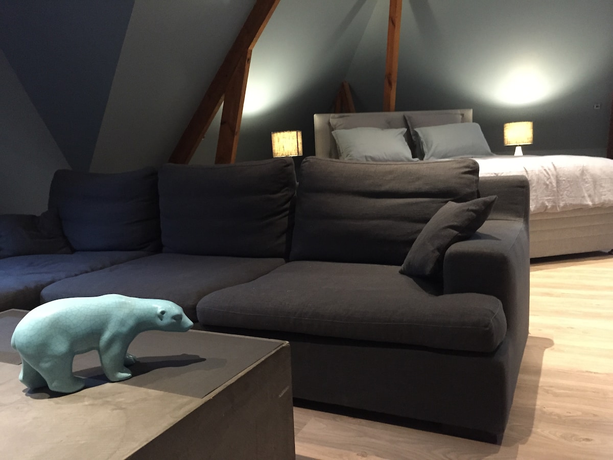 Grande (80 m2) habitación de huéspedes en el campo idealmente situada a 10 minutos de las playas en el triángulo Boulogne (15 m) Hardelot plage (10 m), Le Touquet (20 m). A disposición de nuestros huéspedes, 2 hermosas habitaciones gemelas con capacidad para 4 personas, una gran terraza con salón-comedor y horno multifunción , zona de relajación con un gran jacuzzi, sauna IR y sillón que da a un gran jardín arbolado. Se admiten mascotas si están bien educadas.
