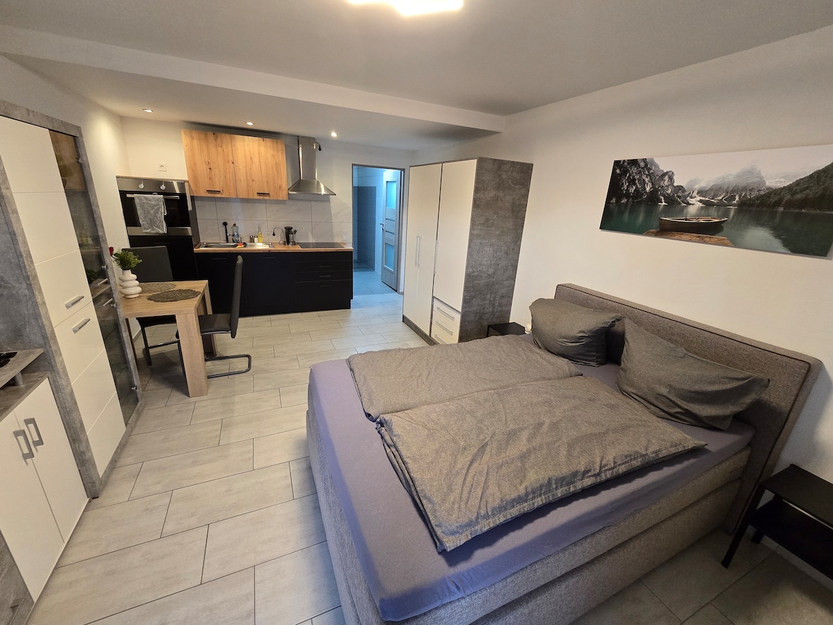 Ettenheim Im Osterbach, ubicación muy tranquila 1 dormitorio con una cama con somier de 1,8 x 2,0, 2 sillas y armario. 1 dormitorio/ sala de estar con una cama de somier 1,8 x 2,0, así como sofá cama 1,4 x 2,0, mesa de la sala de estar, escritorio y TV de 43 pulgadas 1 cocina totalmente equipada lavavajillas, microondas , mesa de comedor y 6 taburetes Baño con bañera y cabina de ducha de cristal Pasillo con armario y espejo grande Estación de carga para coche eléctrico previa solicitud, carga por cable tipo 2