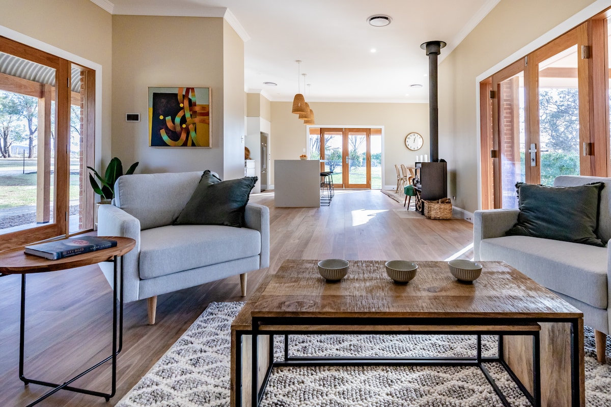 Abercorn is an elegant, architect-designed country house set on a lovely farm, surrounded by Mudgee's famous vineyards and only 7 minutes from Mudgee CBD. Spacious, stylish, with light-filled interiors and views from every window of the farm, vineyards and countryside. Personal recommendations for Mudgee provided after you book, and a complimentary bottle of beautiful local wine on arrival. Abercorn is a Holiday Home of the Year for 2025. Not available for parties or weddings.