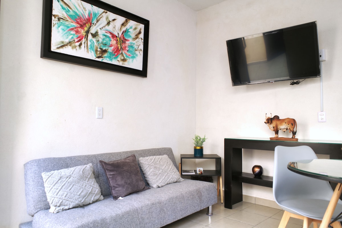 ¡Bienvenidos a nuestro acogedor departamento estilo Boho chic en Peña de Bernal! Este espacio único ha sido cuidadosamente decorado para brindarte una experiencia de relajación y tranquilidad durante tu estancia. Con toques artesanales y una atmósfera cálida, te sentirás como en casa desde el momento en que entres por la puerta. Disfruta de las vistas de la vegetación de la región mientras te relajas en nuestra cómoda sala o en el acogedor balcón.