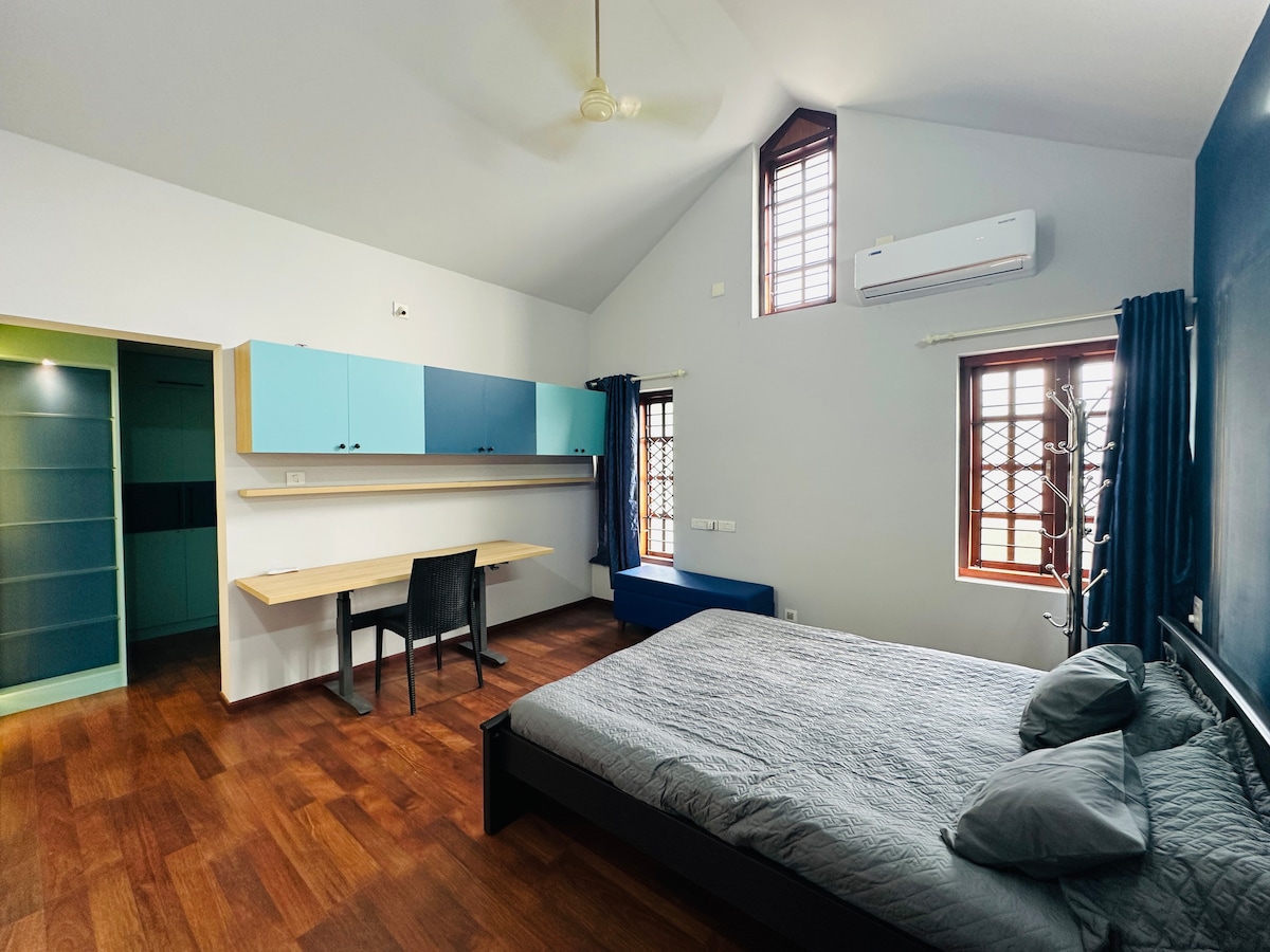 Welcome to your home in Kannur! Nestled within a secure, large villa complex, this 4-bedroom residence offers the privacy of a home with the amenities of a high-end stay. Enjoy a cool night's sleep in our three AC-equipped bedrooms. With plenty of space for the whole family also enjoy the quiet surroundings of the complex. Amenities at a glance: • Full Furniture & AC • Kitchen with Fridge & Utensils • Secure environment with exterior CCTV • Just a short 3km drive to the heart of Kannur Town.