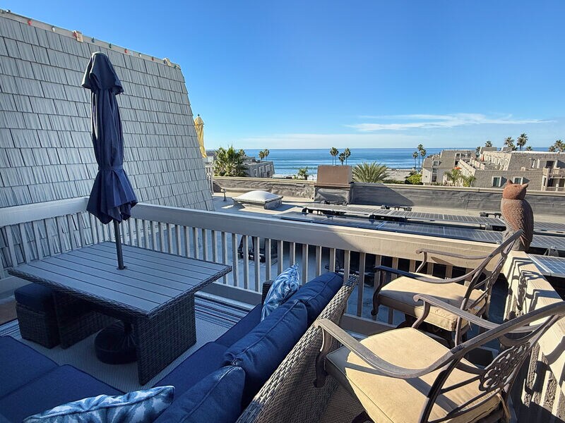 Patio on the Pacific has beautiful ocean views from the living room, master bedroom, and balcony. On a nice day in Oceanside, you can enjoy the sailboats going by on the Pacific from the couch! To relax and recharge, use the buildings pools and spas or enjoy the 5 min walk to the beach + strand. Enjoy working here with 200mbps Internet and a dedicated desk in the bedroom. Our condo is a corner unit on the top floor (accessible via elevator) of building G in the North Coast Village.