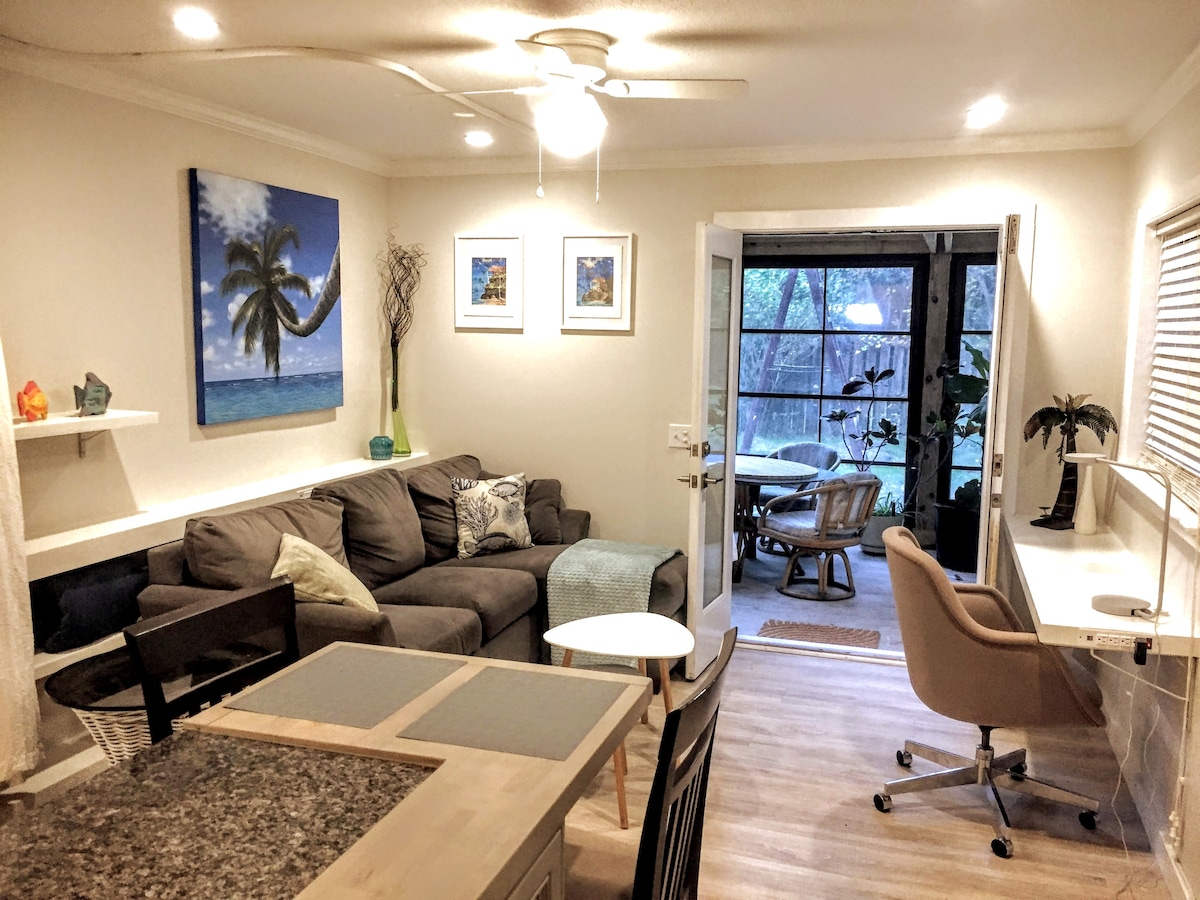 Este pintoresco y acogedor dormitorio cuenta con una cama tamaño queen y un baño, junto con un hermoso solárium con vistas al jardín del piso al techo donde puedes relajarte y descansar. El dúplex ofrece una entrada sin escalones en el primer piso. Disfrutarás de un patio trasero privado con un exuberante jardín, a pocos minutos de la histórica playa Fernandina y a menos de una milla de las hermosas playas de Amelia Island. Situado en el corazón de la isla de Amelia, cerca de todo, en un vecindario ecléctico bordeado de majestuosos robles isleños.