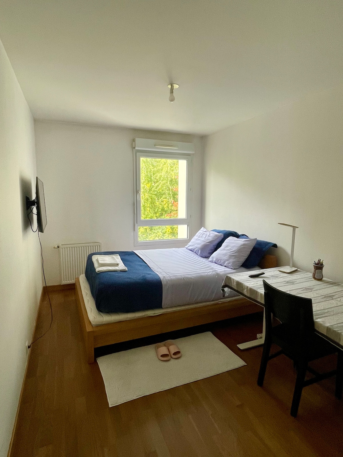 Nuestro encantador apartamento, situado a 5 minutos del aeropuerto de Ginebra, está amueblado con un espíritu «hygge». Decorado con muebles de bambú en estilo asiático, ofrece un verdadero cambio de escenario. Disfrute del salón con pantalla gigante o relájese en la terraza equipada con barbacoa y muebles de jardín. El gran dormitorio, con TV y tocador, ha sido diseñado para su comodidad. Nota: el terreno de enfrente está en construcción, sin actividad por la noche o los fines de semana.