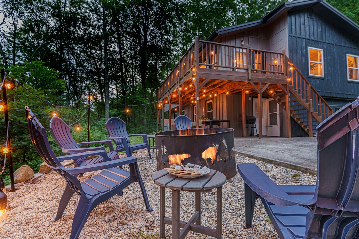 Bienvenido a tu cabaña totalmente privada, donde tendrás completa serenidad, rodeado de nada más que el bosque Blue Ridge. Elige tu placer: la sala de juegos en el sótano, los asientos y servicios al aire libre en las grandes terrazas traseras, las cómodas camas tamaño king, el magnífico y moderno interior de la cabaña o aventurarte por el bosque para encontrar nuestro pozo de fuego privado junto al relajante arroyoque que corre justo por la propiedad. ¡Serán unas vacaciones de las que nunca querrás marcharte!