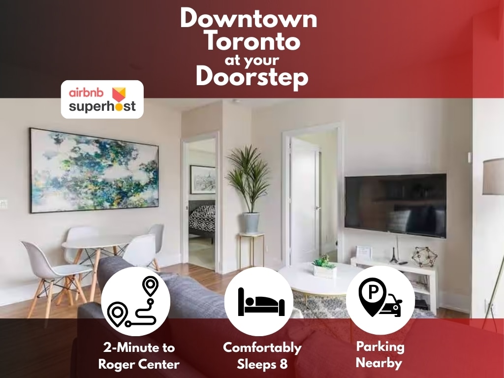 ¡Te damos la bienvenida a tu nuevo hogar lejos de casa! Perfectamente ubicado en el corazón del centro de Toronto y a pocos pasos de las atracciones más codiciadas, tiendas, restaurantes, cafeterías, clubes y bares. Características: → APARCAMIENTO GRATUITO → Cocina totalmente equipada. → Lavadora y secadora en suite → 2 dormitorios, cada uno con una cómoda cama matrimonial. → Sala de estar con TV de 65pulgadas, Netflix/DAZN Internet → de alta velocidad de 1 GB para el trabajo a distancia A → 10 minutos a pie de CN Tower, Rogers Centre, Convention Centre, King St y Waterfront