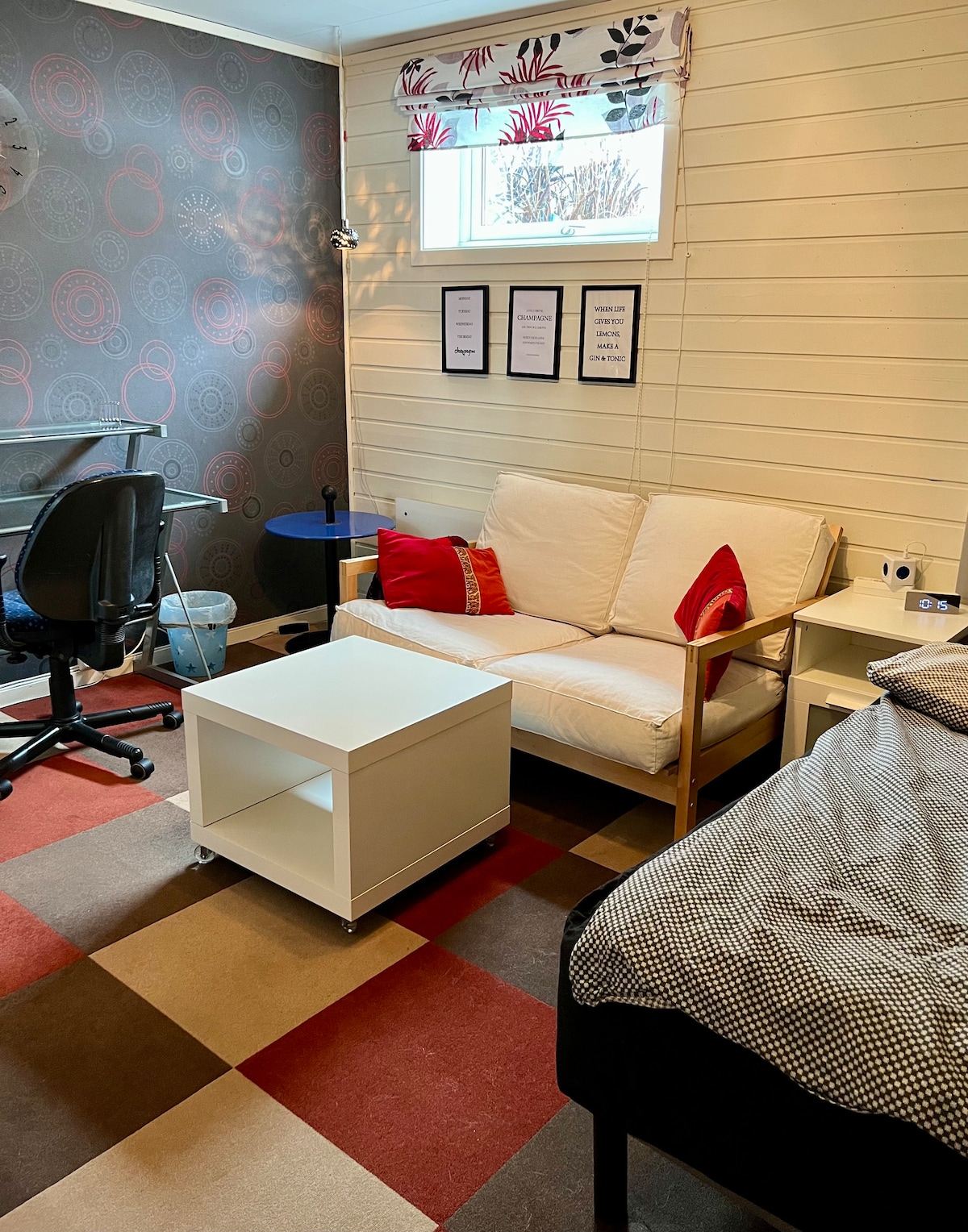 Room with small double bed for rent in a 200 m2 house with two floors located in Vadsø in a quiet neighborhood, close to the nature with excellent possibilities of hiking and trips. The house has all facilities and a large terrace and garden. 20 minutes walk to city center (2 km). The room is downstairs, is 15 m2 and has a small double bed (140 x 200 cm) and a TV connected to Apple-TV The bathroom with sauna are exclusive for the guests in the rental rooms.
