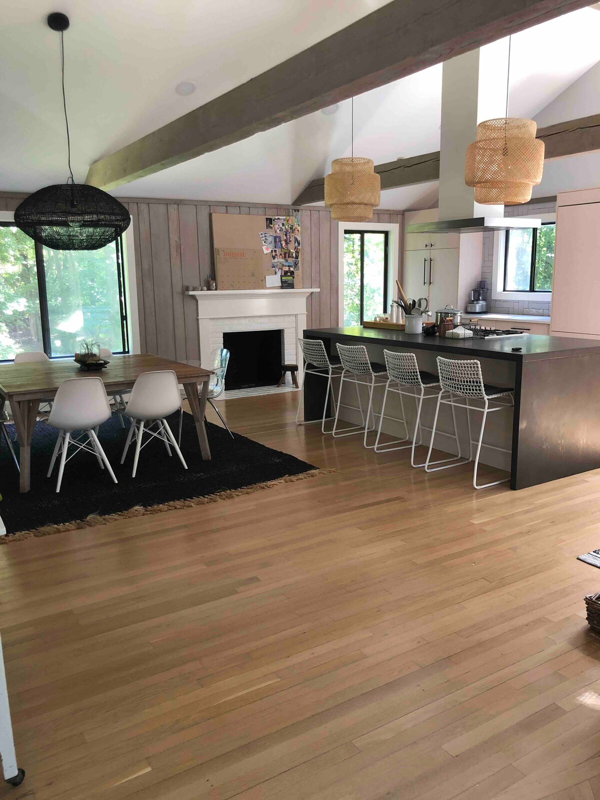 Icónico bungalow de playa y piscina de los años 70 ubicado en una parcela privada de 3/4 acres rodeada de robles maduros y árboles de hoja perenne. Nuestra casa está designada intencionalmente por diseñadores de interiores, llena de artículos de colección, arte y antigüedades. Disfruta de la sensación de ‘Hamptons Bohemia’, con una sala de estar abovedada, amplios asientos, una chimenea de leña y una zona al aire libre con una amplia terraza de cedro y una piscina climatizada. Ubicado a pocos pasos de las playas de la bahía y a 8 minutos en auto de la playa Ponquogue y The Bowl Spot para surfear.