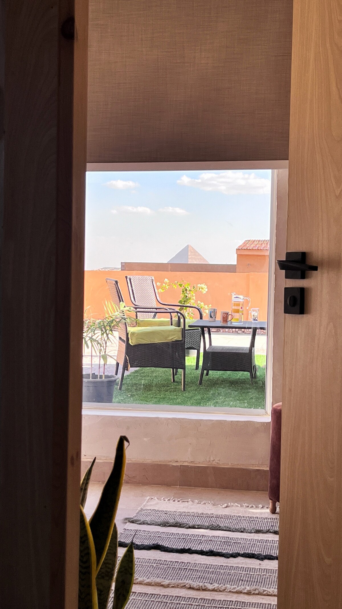 El Khan de las Pirámides, un refugio único donde el diseño artesanal se encuentra con maravillas antiguas. Este sereno apartamento se encuentra en El Haram y ofrece una vista directa de las pirámides desde tu cama o jacuzzi. Cada rincón está lleno de texturas terrosas, piezas seleccionadas y luz natural, diseñadas para la vida lenta, las noches de descanso y las mañanas mágicas con una vista que es realmente inolvidable. Tanto si eres una pareja, un viajero solitario o un alma creativa en busca de inspiración, este Khan es tu refugio en Guiza.