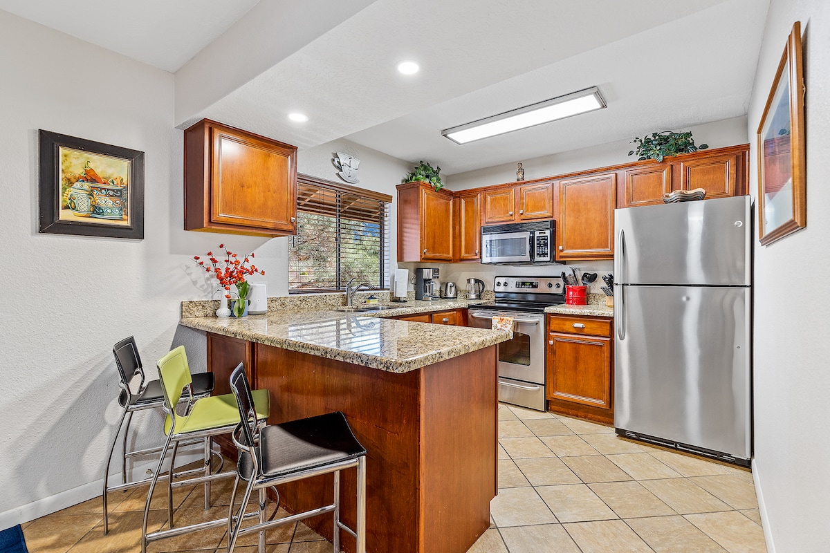 Una encantadora y cómoda casa adosada de Country Club, de un solo nivel, 1 dormitorio con cama tamaño king en el dormitorio principal y un sofá cama tamaño queen en la sala de estar. Ofrecemos un ambiente informal y acogedor. Cocina completa con barra de desayuno y comedor y lavadora/secadora en el alojamiento. Hay una maravillosa terraza exterior para relajarse y una parrilla de gas. Nuestro alojamiento es fácil de encontrar y es de fácil acceso a las rutas hacia el Gran Cañón, Sedona y AZ Snowbowl. *¡AHORA con aire acondicionado!