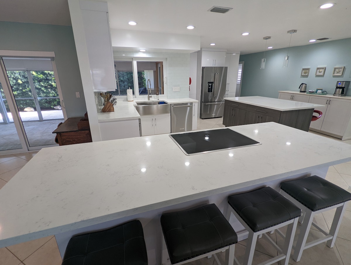 Espacio abierto desde la entrada hasta el comedor, la cocina y el salón. Hay muchos asientos agradables para todos. La cocina está totalmente renovada con electrodomésticos nuevos, junto con los baños. Lavadora y secadora nuevas disponibles justo fuera de la cocina. Tienes acceso completo al patio trasero vallado y acceso a 3 hermosas playas, cada una a unos 7 minutos. A 5 minutos en coche del parque Mizner, con maravillosos restaurantes y entretenimiento. ¡UBICACIÓN PRIVILEGIADA!