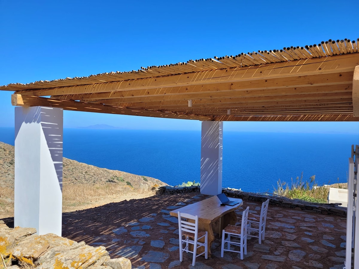 Nuestra villa de nueva construcción se encuentra a la entrada del pueblo de Ano Meria. Un pequeño sendero (transitable en coche) conduce a este lugar llamado "Petinari", donde disfrutará de una vista impresionante de las islas del mar Egeo: Sifnos, Anti-Paros, Paros, Naxos, Sykinos, etc. El lugar, alejado de la carretera principal (300 m), es absolutamente tranquilo. Los primeros restaurantes del pueblo de Ano Meria se encuentran a 6-8 minutos a pie de la villa. Añade 3 o 4 minutos para el minimercado.