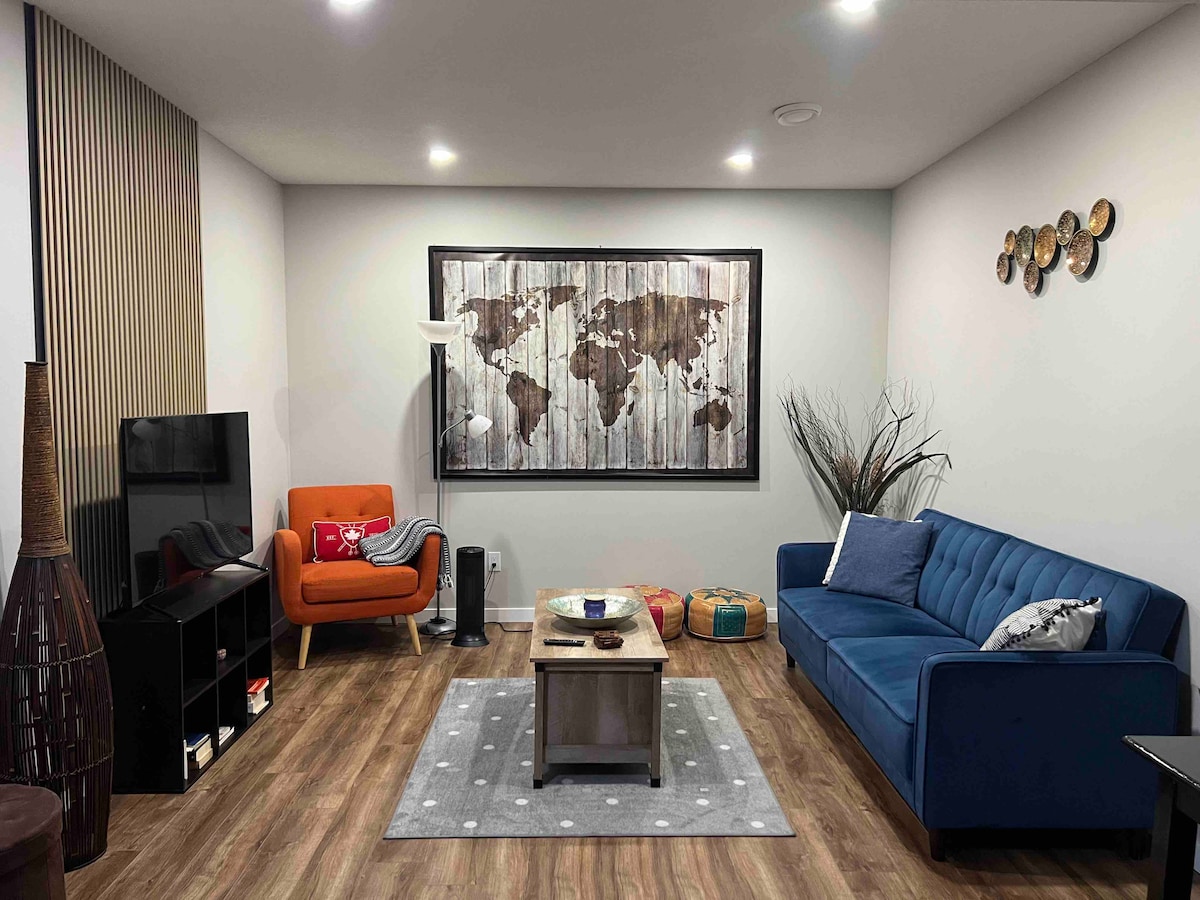Disfruta de una sensación zen al entrar en esta acogedora suite a través de la comodidad de una entrada exterior independiente. Equipada con chimenea eléctrica, TV de 50 pulgadas con Disney Plus y cable, lavandería en la suite, termostato, cocina completa, ropa de cama exuberante, batas suaves, espacio de trabajo dedicado, esterilla de yoga y golosinas, podrás presentarte y disfrutar. Siéntete a gusto sabiendo que la comodidad y la limpieza son nuestras principales prioridades. Accede a Fish Creek Park y al transporte en 5 minutos. Acceso al tren Ctrain y a Spruce Meadows en 10 minutos o menos.