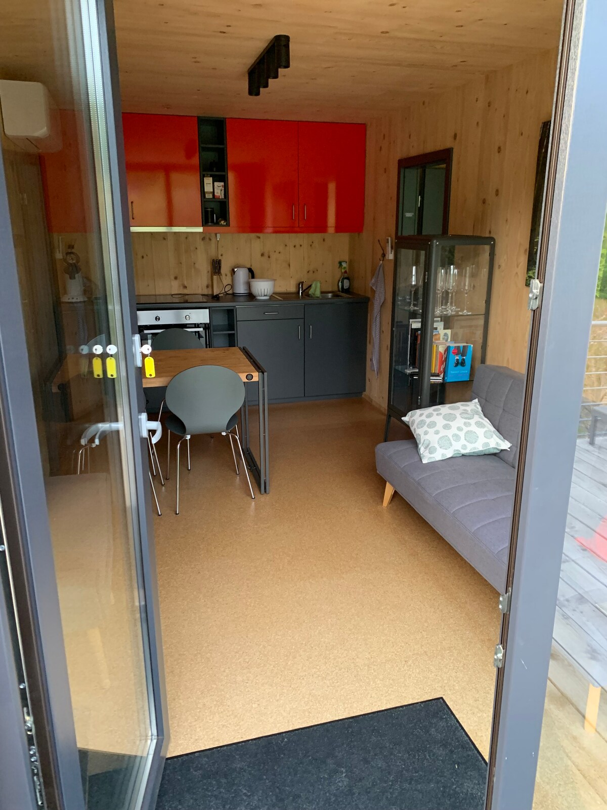 The apartment 50m2. Newly built Wooden House in 2022. The highlight is the 15 m wooden balcony built into the trees. Modern English wooden kitchen , refrigerator, electric stove , dishwasher, smoothie maker asl well al SMEG coffee machine, Media TV , 1 Bedroom : 180x200 m bed as well a 1 small single bed. a Futonsofa which coverts into a compromise sleeping place 180x200 m can be used as extra sleeping facility in the living room.