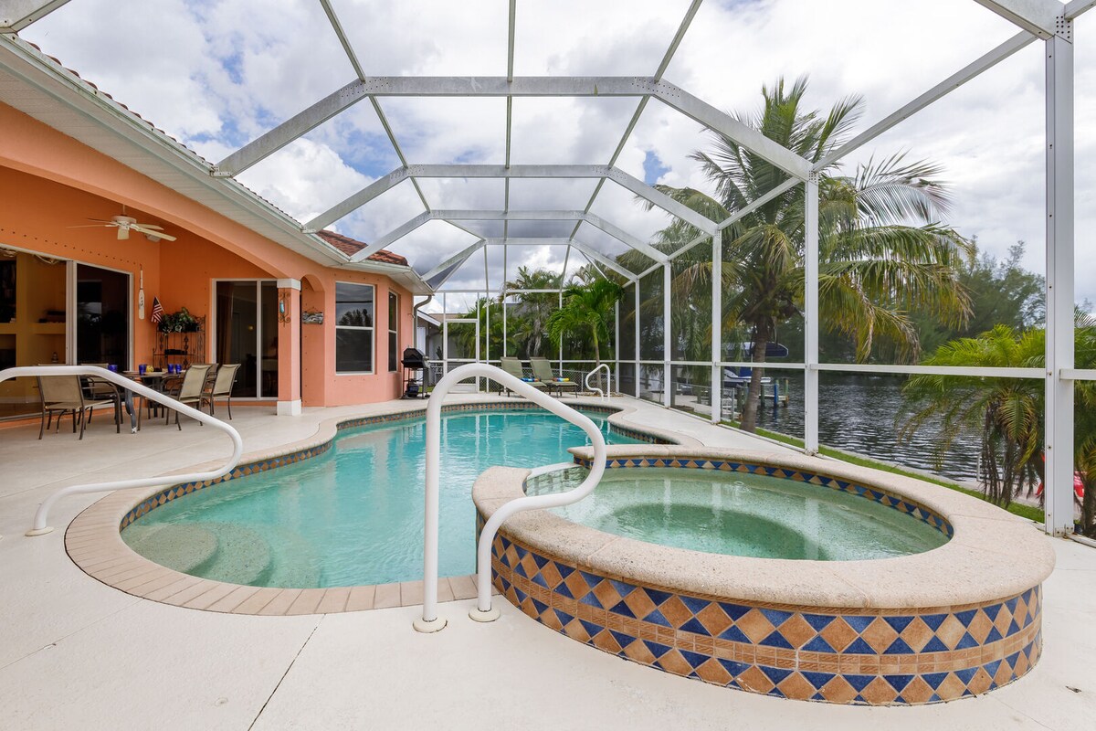 Welcome to sunny Cape Coral! At Palaco Paradise, enjoy an AMAZING HEATED POOL with sun on the lanai all afternoon. Grill out, relax, or head 30 mins to Fort Myers Beach—beach gear included! Stay 4+ nights for FREE waterpark passes. Fish from the backyard or take a 5 MINUTE BOAT DRIVE TO THE RIVER from your own personal dock! Fresh coffee is ready when you arrive, and you're just 35 mins from the airport. Everything you need, nothing you don’t—just sunshine, water, and pure relaxation!