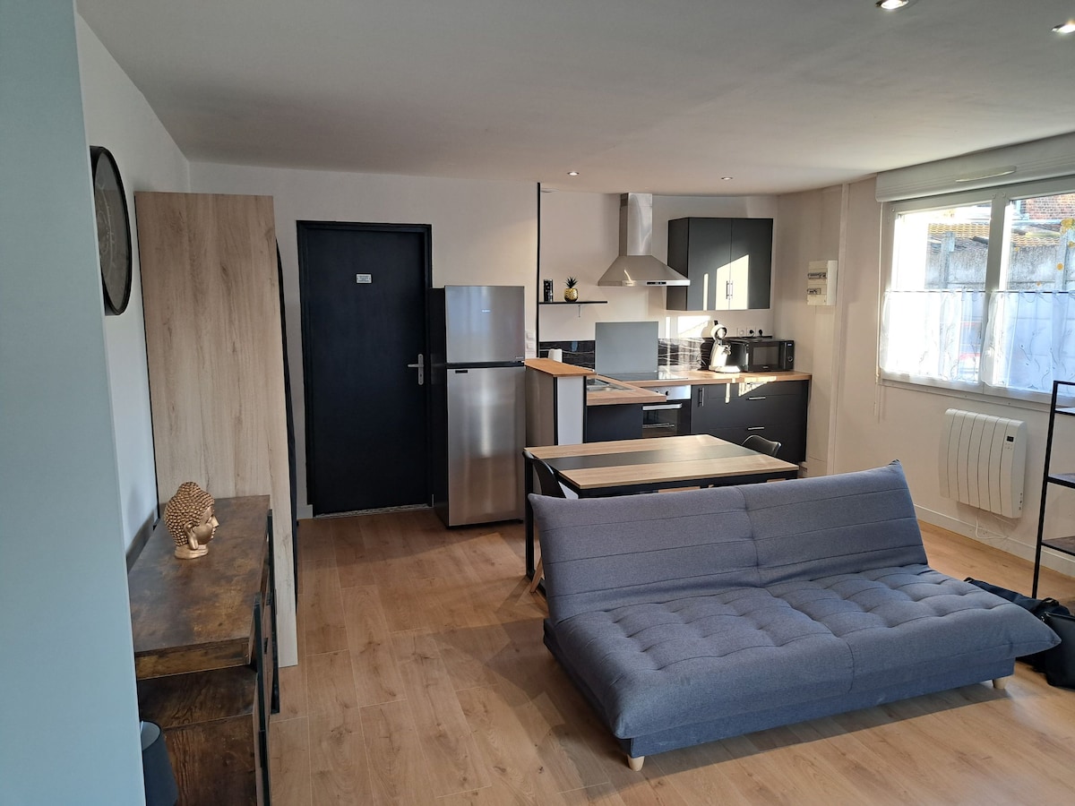 En una propiedad tranquila con aparcamiento seguro, podrá alojarse en un estudio nuevo de 16 m², independiente, para 2 personas. El alojamiento: Cocina con nevera y placa de cocción Cama de matrimonio (140x190) Cuarto de baño con ducha e inodoro TV y wifi Se proporcionan sábanas y toallas Ubicación en el centro de la ciudad con restaurantes cerca a los que se puede ir andando. Sitios turísticos en las cercanías: Nuestra Señora de Loreto Las escombreras gemelas El memorial canadiense Estadio Bollaert-Delelis del RC Lens