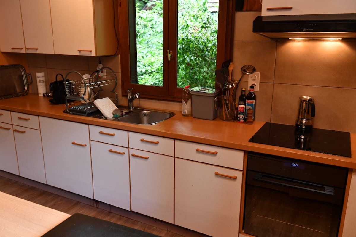 Sumérjase en la tranquilidad de este apartamento de 3,5 habitaciones en el segundo piso de una encantadora casa de campo reformada en La Tanne. Con 150 metros cuadrados, esta habitación luminosa y espaciosa ofrece un refugio cómodo para hasta 7 personas. Aquí encontrará un dormitorio principal con una cama doble, un dormitorio adicional con una litera y una cama de 140 cm, así como una sala de estar con un sofá cama para invitados adicionales. Los techos altos dan una sensación de W