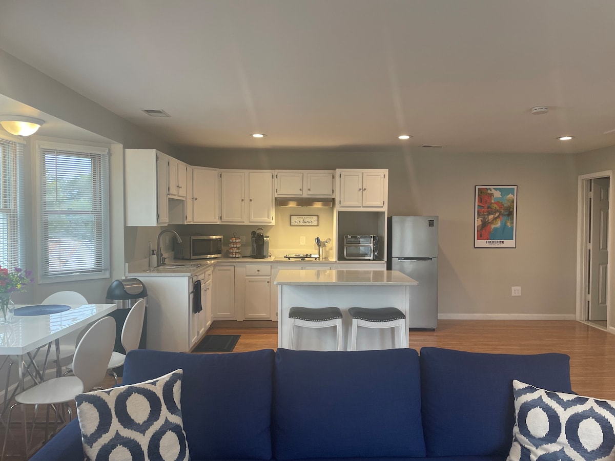 ¡A los huéspedes les encantará este apartamento del centro de la ciudad, bellamente renovado, que cuenta con todas las comodidades modernas y conserva su encanto histórico! Más de 1650 pies cuadrados de sala de estar y una gran terraza al aire libre junto al dormitorio principal para disfrutar en los meses más cálidos. A poca distancia a pie de las maravillosas tiendas y restaurantes del centro de Frederick y del galardonado Carroll Creek Linear Park (no te pierdas los barcos temáticos navideños durante los meses de invierno) y a poca distancia en coche de senderismo, parques y bodegas.