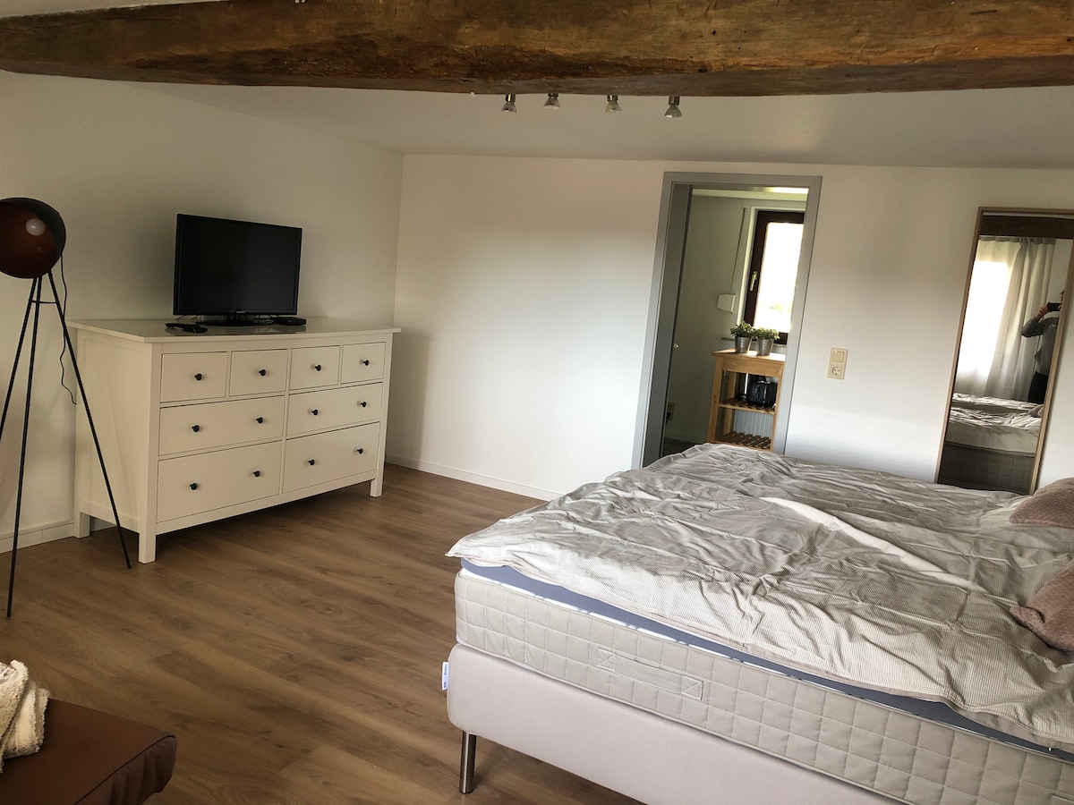 Alquilamos un hermoso apartamento de 2 habitaciones con cocina y baño en el centro de la ciudad de Waechtersbach. El apartamento del ático fue renovado hace unos años e impresiona con una yuxtaposición armoniosa de viejas vigas de madera y diseño moderno con ventanas profundas y vistas al campo. El jardín del castillo con el castillo restaurado está enfrente. La conexión de tren es excelente (cada 30 minutos a Frankfurt). Las compras y los restaurantes están a pocos pasos a pocos pasos.