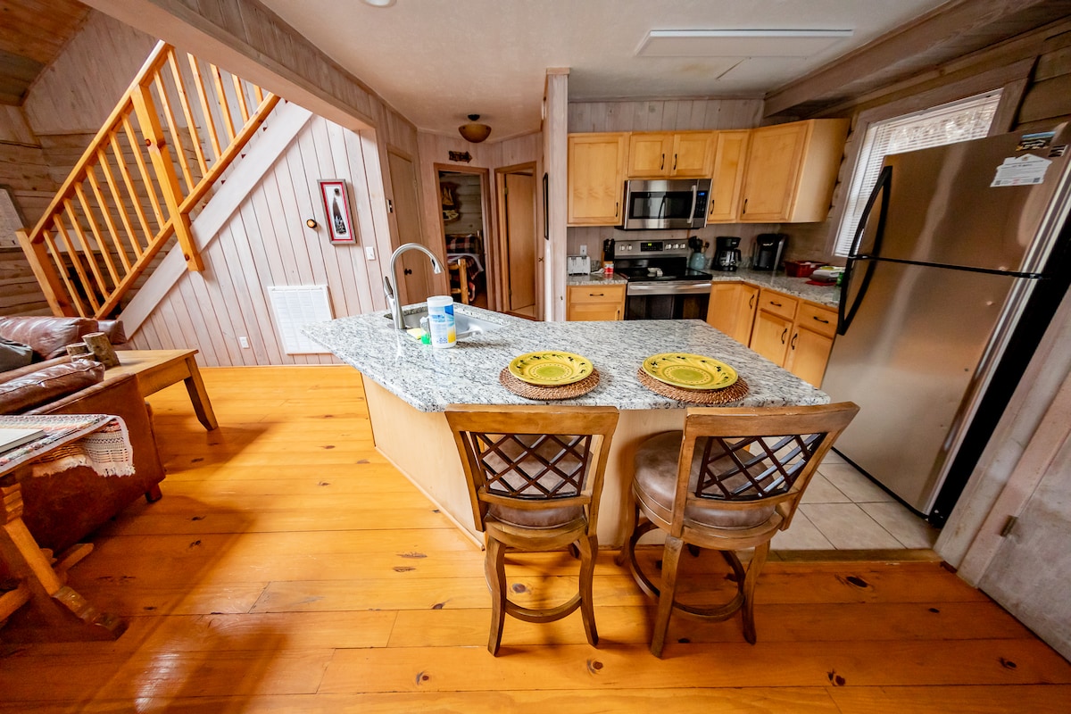 Nuestro acogedor chalet de dos dormitorios se encuentra en Hayesville y a 15 minutos de Blairsville y Hiawassee, Georgia. Disfrute de la primavera, que llega desde el balcón o a través de la ventana, mientras disfruta de la calidez de una chimenea de leña a gas al terminar el invierno. Las actividades recreativas al aire libre en el lago Chatuge y el río Hiawassee están a pocos minutos. Hay restaurantes de alta cocina en los alrededores, o bien puede disfrutar de una comida en el balcón mientras contempla la puesta de sol.