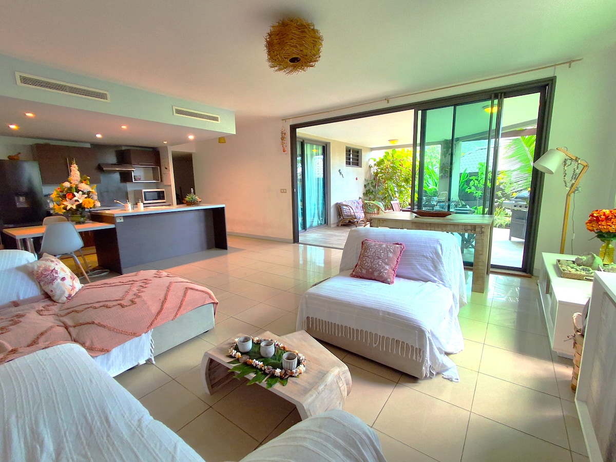 Ubicado en la exuberante vegetación, este Fare de madera típica le cambiará de aires inmediatamente. Bien equipado, funcional y lleno de encanto, tiene acceso privado. Se encuentra en una residencia tranquila y segura, sin vecinos, a 10 minutos del aeropuerto, a 5 minutos de las tiendas, las playas y las actividades náuticas. ¿Un cóctel junto a la piscina, con vistas al océano Pacífico y a la isla de Moorea? A su alrededor, un hermoso jardín arbolado multicolor, el canto de los pájaros ... el paraíso en la Tierra ;-)