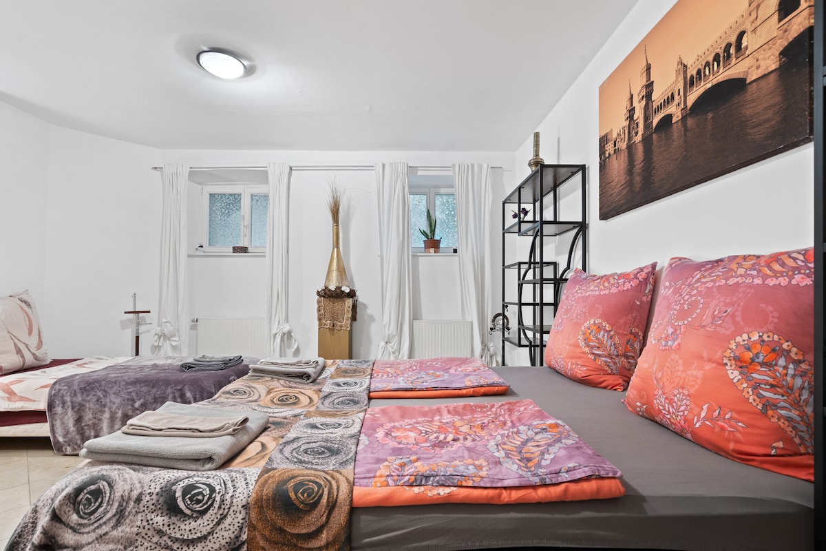 Conversión no convencional del sótano de 2 habitaciones (55 m2) en el corazón del centro. Situado en el edificio histórico (siglo XIX). Ideal para una estancia CORTA de un grupo (hasta 6 personas). VENTAJAS: la mejor ubicación de la ciudad (a pie a la mayoría de los 10 lugares de interés principales) + ropa de cama y toallas + WiFi + instalaciones de cocina + garaje profundo (32 €/día) + check-in por la noche posible + cama de bebé (si es necesario) + secador de pelo CONTRAS: ubicado debajo del nivel del suelo -> aislamiento de sonido oscuro y deficiente - sin aire acondicionado - sin puerta entre ambas habitaciones - caro