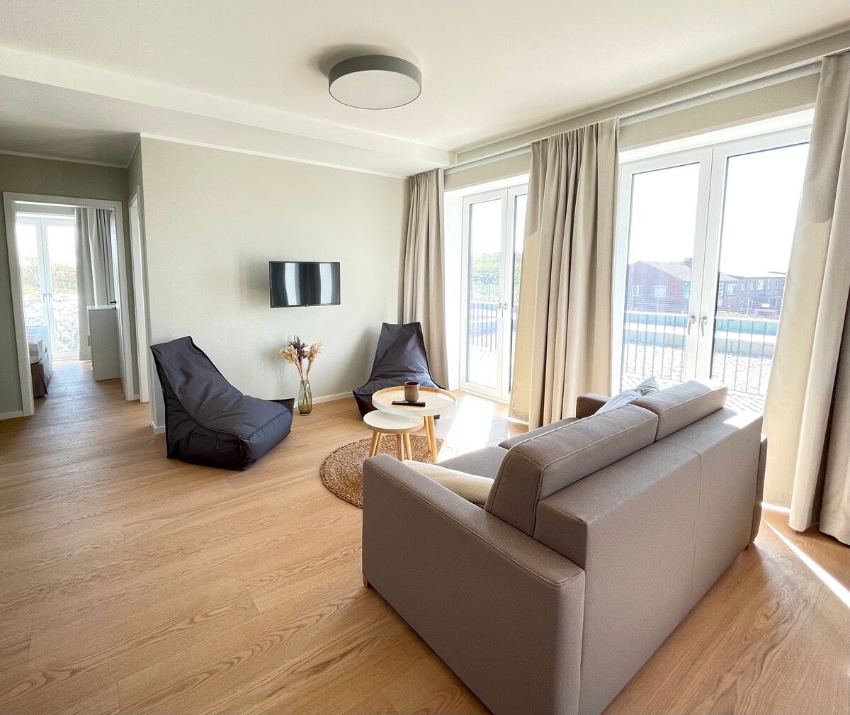 Los apartamentos tienen unos 39 metros cuadrados y son adecuados para 2-3 personas. La sala de estar está equipada con sofá cama, sillón y TV. También hay una mesa de comedor con sillas y cocina americana totalmente equipada. También se proporciona lavavajillas y microondas. En el dormitorio semi dividido hay una cama de somier (160 x 200). En el baño, el inodoro y un secador de toallas, así como un secador de pelo. Mascotas bajo petición.